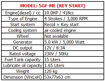 MITSUKI Diesel Generator 5GF-ME model is designed to serve as power generating unit of medium capacity which supply electricity for lighting purpose as well as for household electric devices used in towns, villages or worksites. It can also be used as a reserved power source for emergent case. It can generate electric power up to 5,000 watts at 220 volts with a fuel tank capacity of 15 liters. Apart from AC 220V supply, it can be used to charge the battery DC 12V (8.3 A)